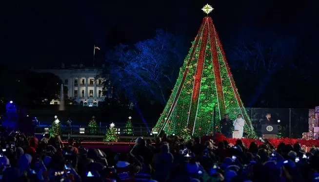 The National Christmas Tree is a living Colorado blue spruce. It is surrounded by 56 smaller trees featuring ornaments from every state and territory and the District of Columbia.