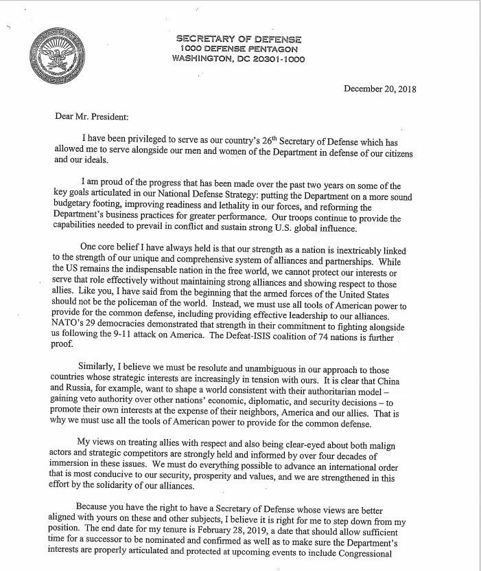 In his resignation letter, Mattis alluded to disagreements with Trump as the reason for his departure.