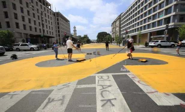 WASHINGTON - City workers and activists painted the words Black Lives Matter in enormous bright yellow letters on the the street leading to the White House, a highly visible sign of the District of Co...